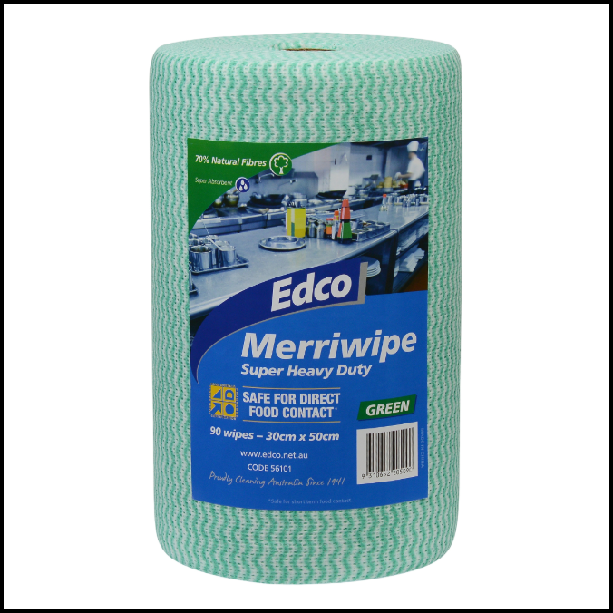 easy tear-off sections. These cloths combine the strength of synthetic fibre with the all natural super absorbent fibres of viscose to make them the most absorbent wipe in our range. The Edco Merriwipe range can be used wet or dry and is a reusable washable product.