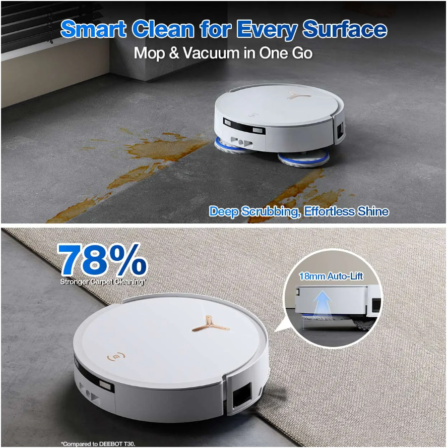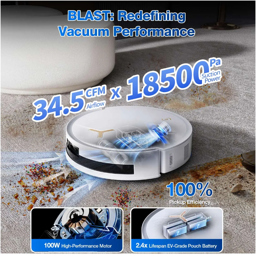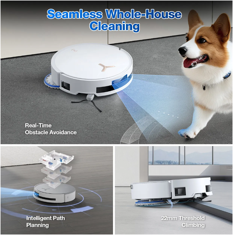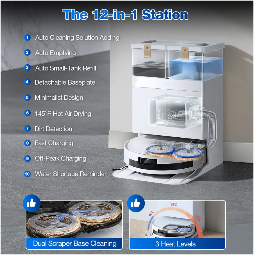 - OMNI Station Upgrades: 40-75℃ mop wash, 65℃ hot air dry, auto cleaning solution.