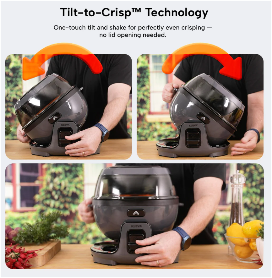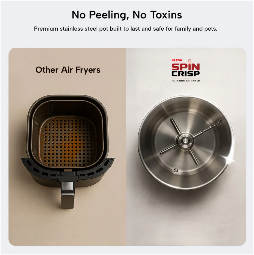 Tired of peeling, hard-to-clean air fryer baskets that leave food soggy or unevenly cooked? The Kleva® Spin Crisp Air Fryer makes crispy, golden meals effortless with innovative 360° rotating cooking, fat-draining tilt technology, and a durable stainless steel design.