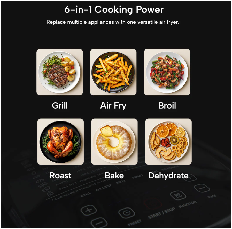 Functions: Grill / Air Fry / Broil / Roast / Bake / Dehydrate / DIY