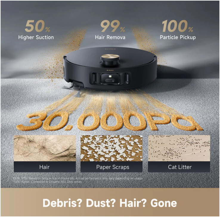Accurately detects obstacles, identifies 240+ objects, and sees dirt in poorly lit areas for a safer, thorough clean, thanks to its 3D structured light, LED light, and AI action camera.