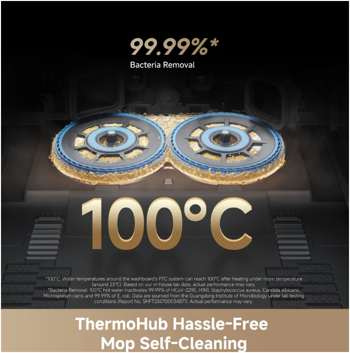 The Matrix10 Ultra features an independent self-cleaning routine with 100°C hot water and 20 spray nozzles. It effectively removes over 99.99% of bacteria while keeping its mop pads fresh. Its PTC cooling system ensures safety, and the water outlet guarantees thorough cleaning after each use.